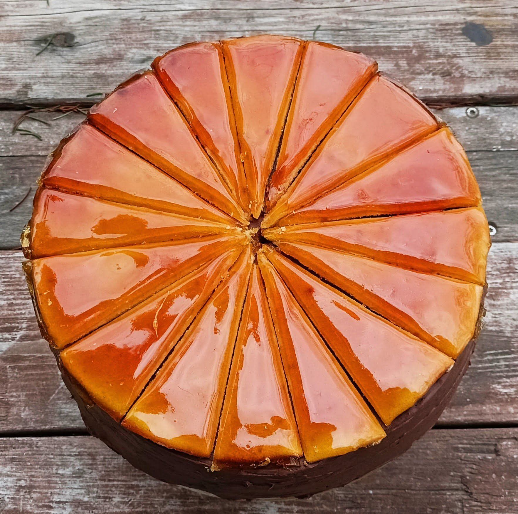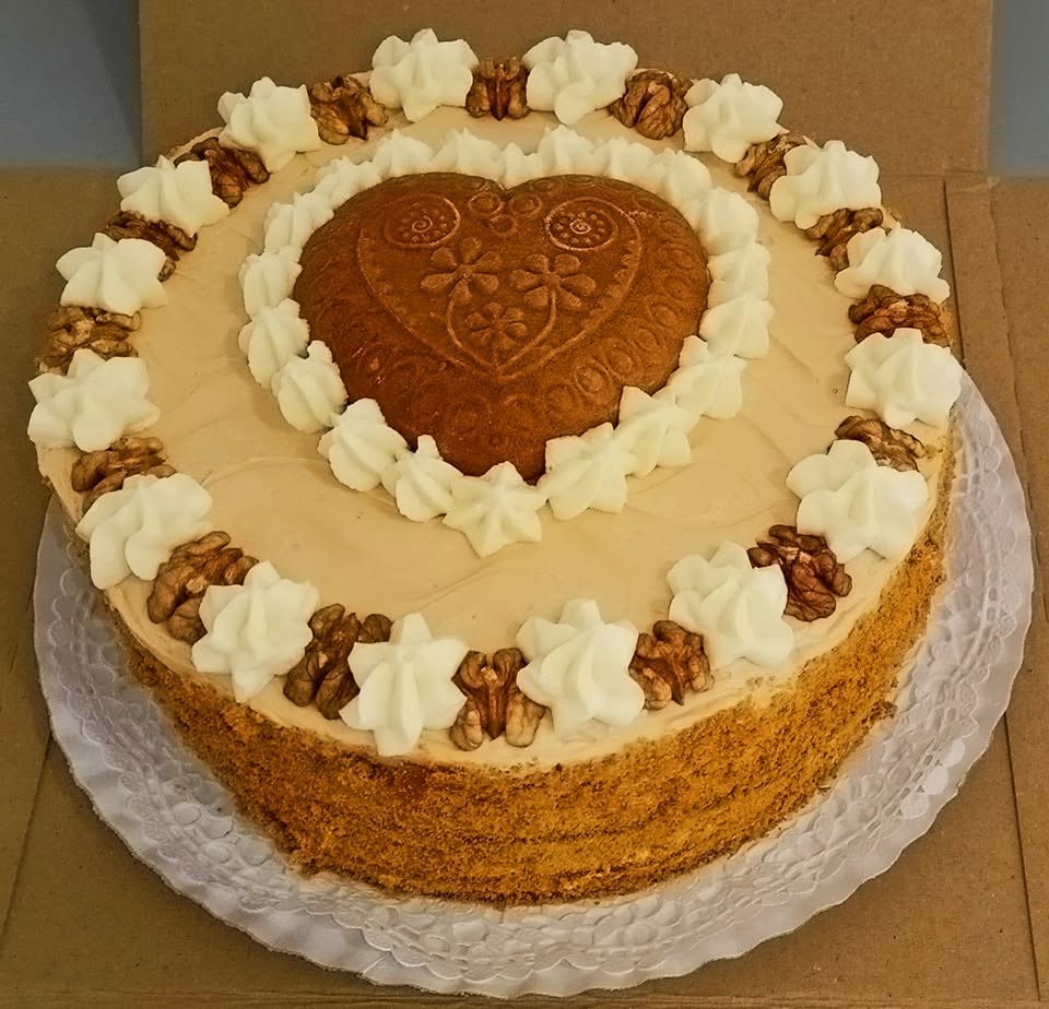 Mézes Magdalenka torta (6-7-8-9 mézes omlós tészta lap, kézzel nyújtott, kisütött). Kajmakos karamellás vajas tejszínes krém. Kakaó vagy dísz a tetején. Mézes sütemény többszörös díjnyertes különlegesség.